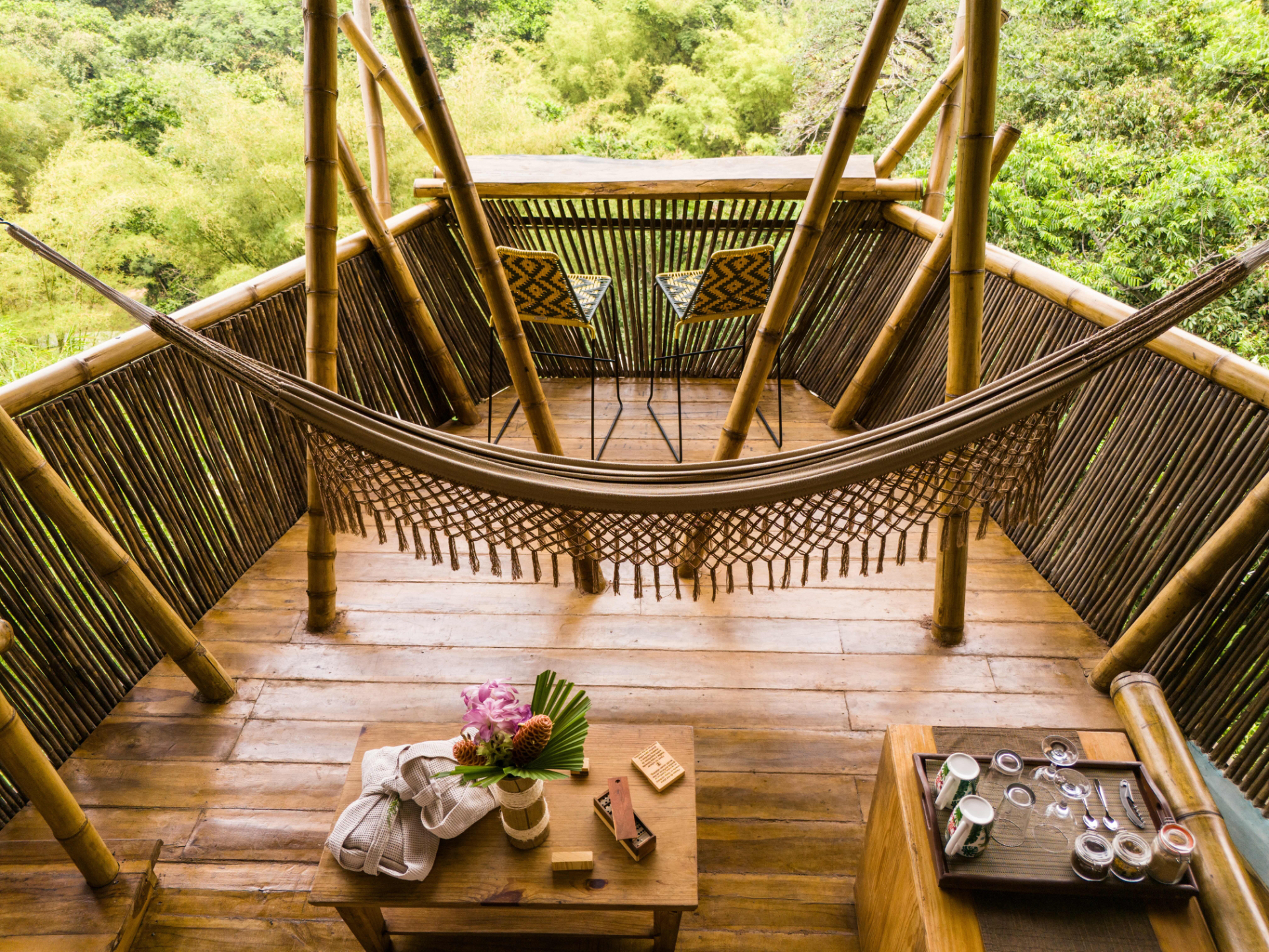 Nuestras estructuras independientes están conectadas al suelo por un puente de madera y se distribuyen en tres niveles: un amplio baño con agua caliente en la entrada, una terraza en la sala de estar con una cama individual en el segundo nivel y, unos escalones más arriba, dos camas individuales más con una fascinante vista de las montañas y la selva al despertar.